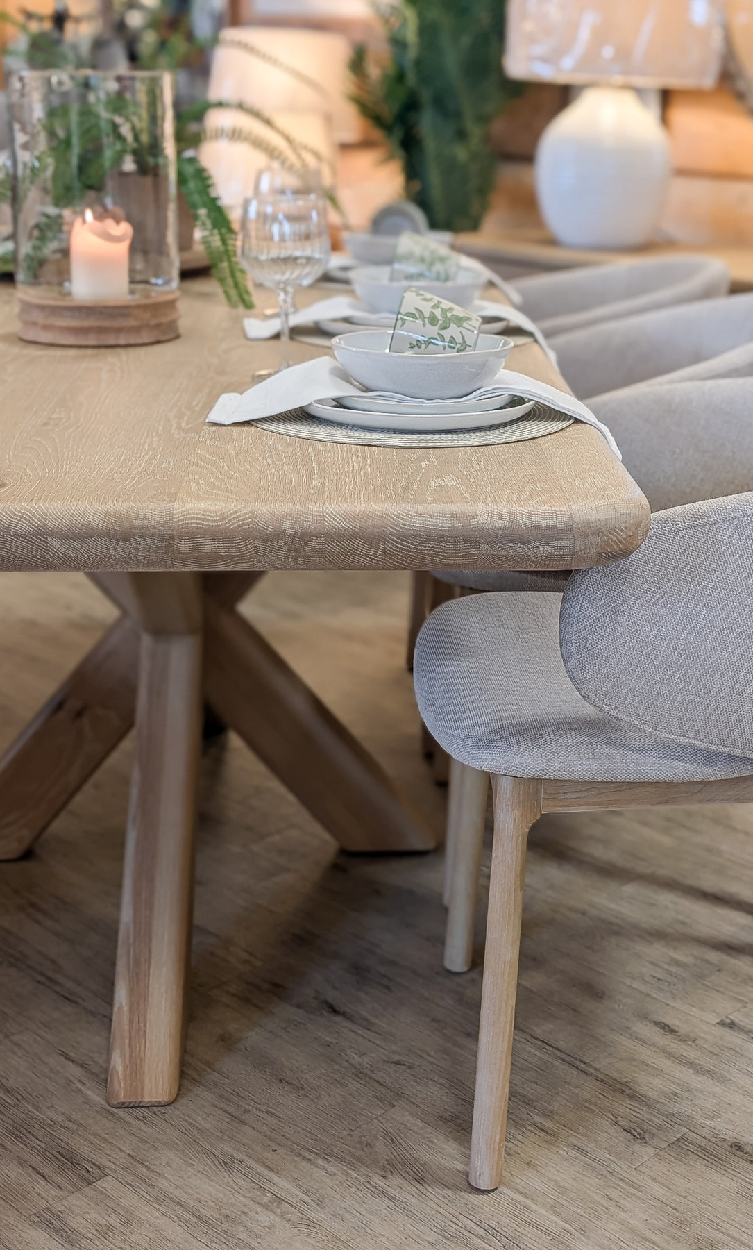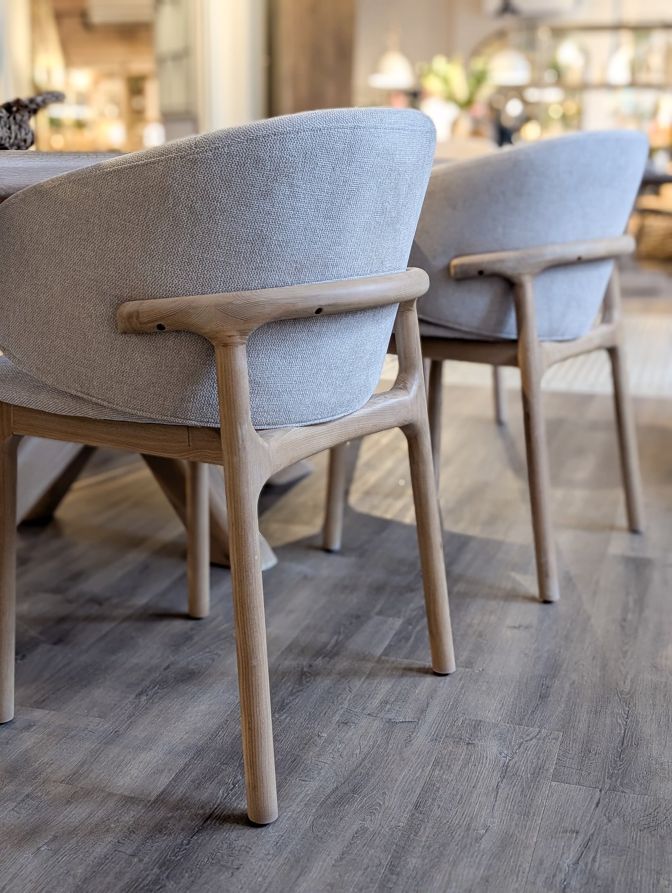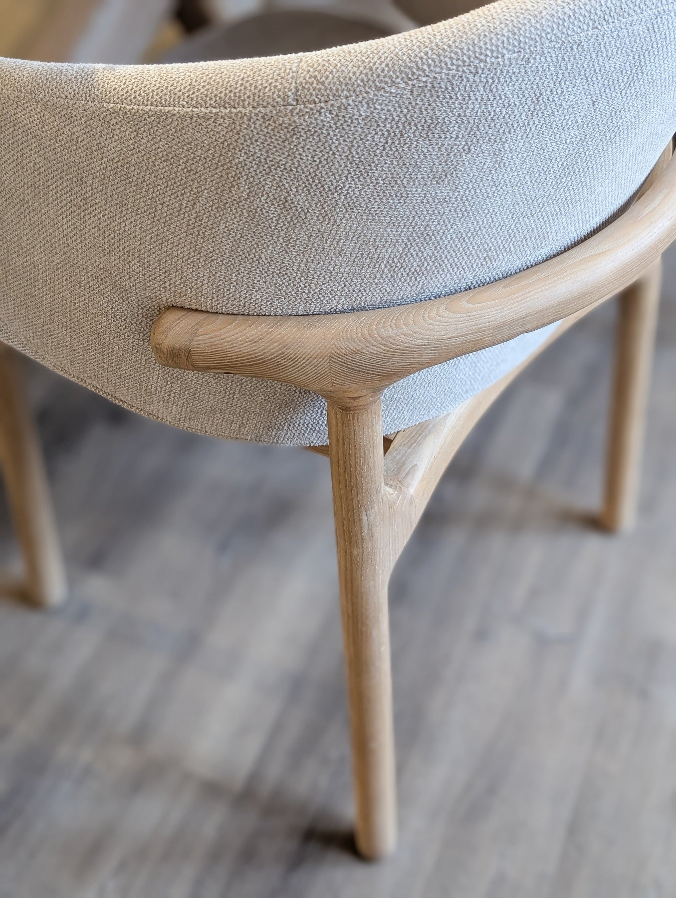Elevate your dining experience with the mid-century inspired Nora dining chair, thoughtfully designed with supportive arms and a softly curved back for relaxed, comfortable seating. Upholstered in a soft, refined fabric in a versatile neutral tone, it brings an airy, understated elegance to the table. Pair with the Fulham range to complete the look.