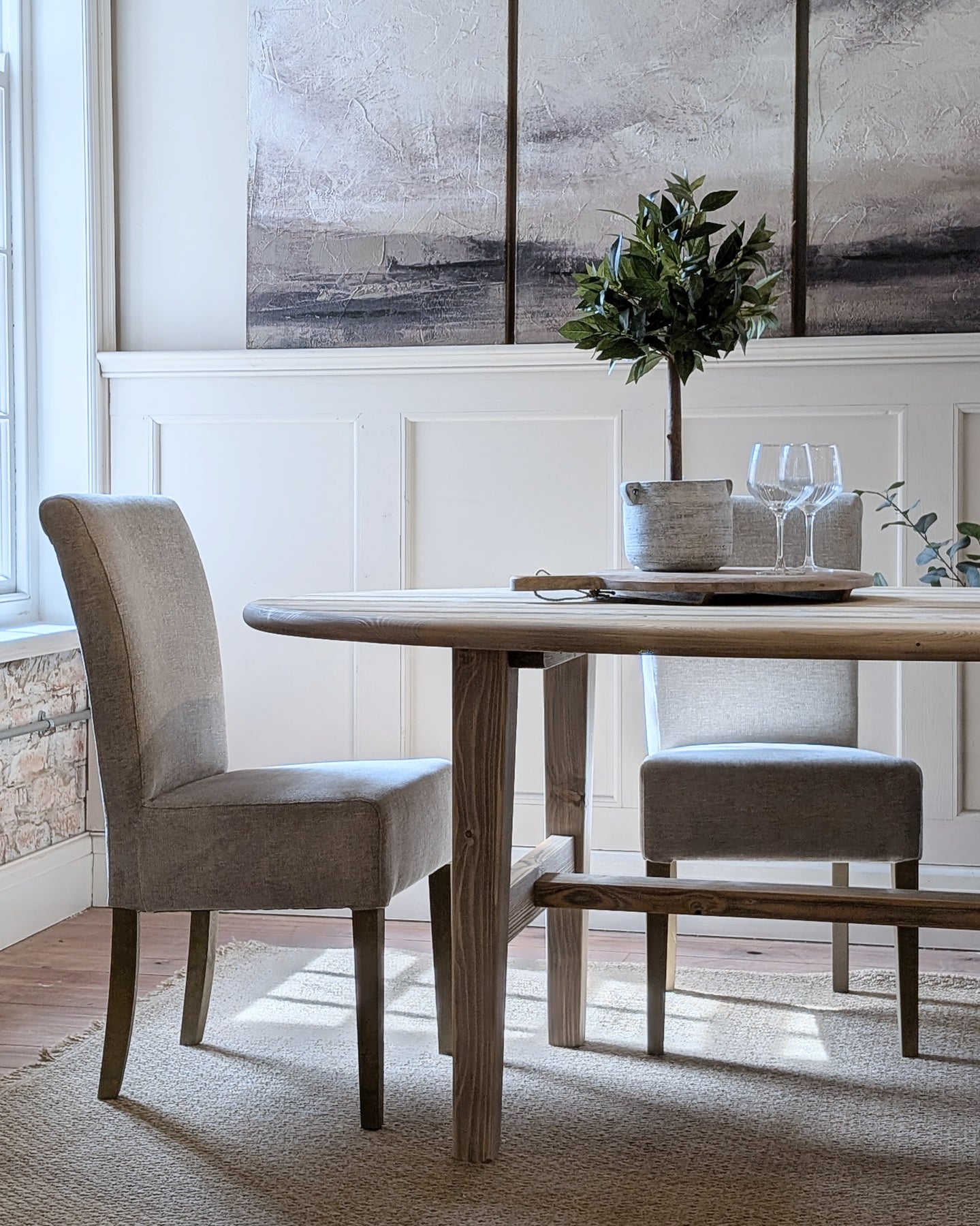 This Taupe model is upholstered in the perfect neutral and completed with a grey wash leg, ideal for complementing any dining setting.