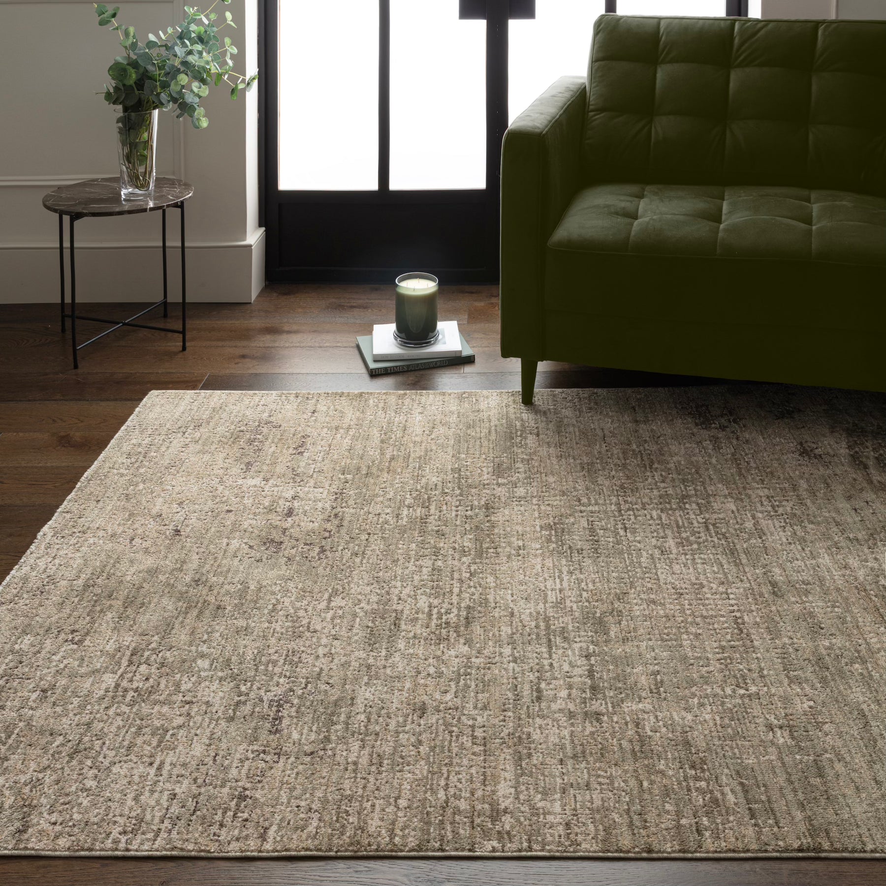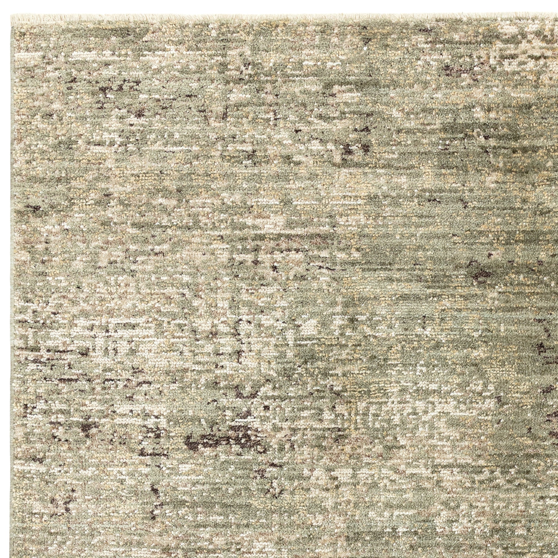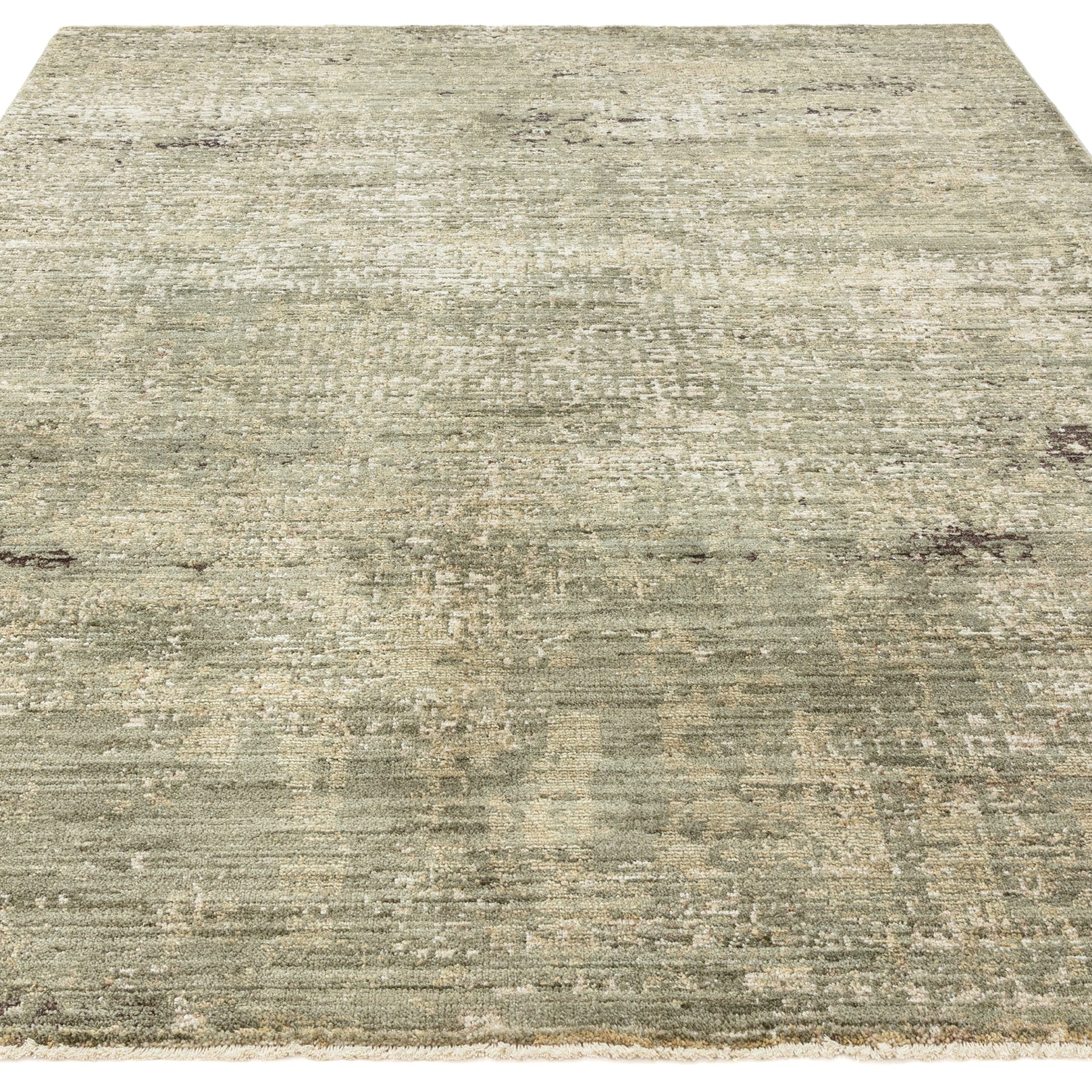 A quietly atmospheric piece, this rug feels almost time-softened. Tones of muted green blend with warm neutrals in a gently distressed finish, creating depth and texture without overpowering.
