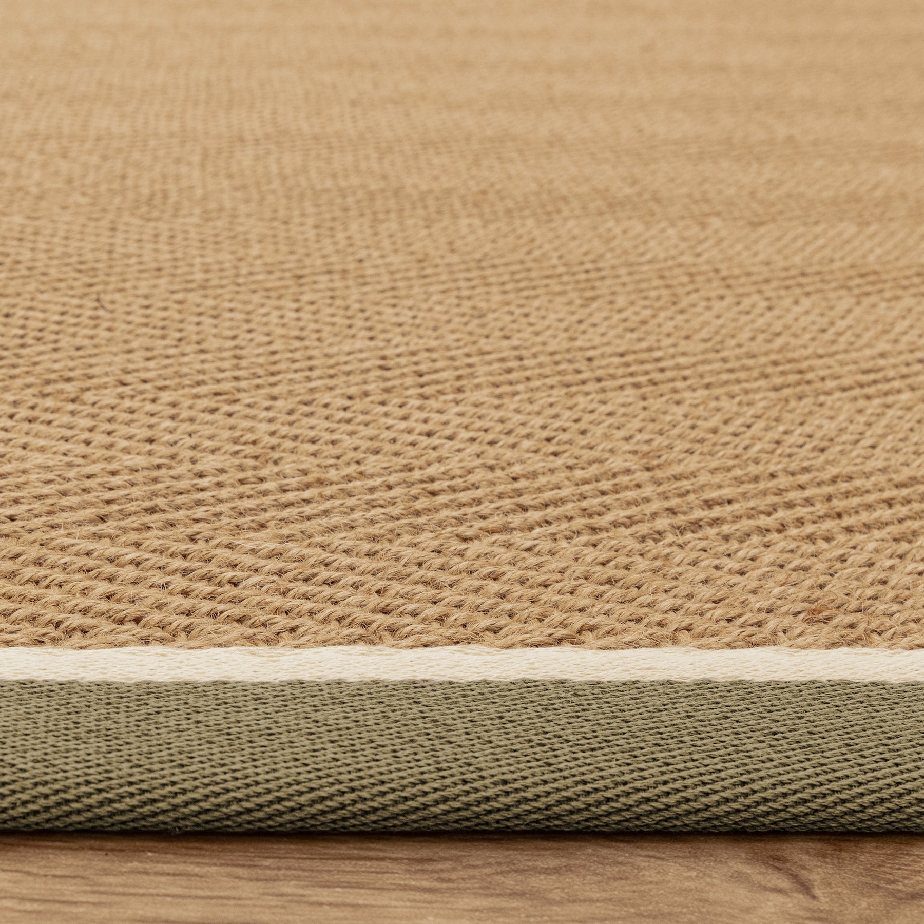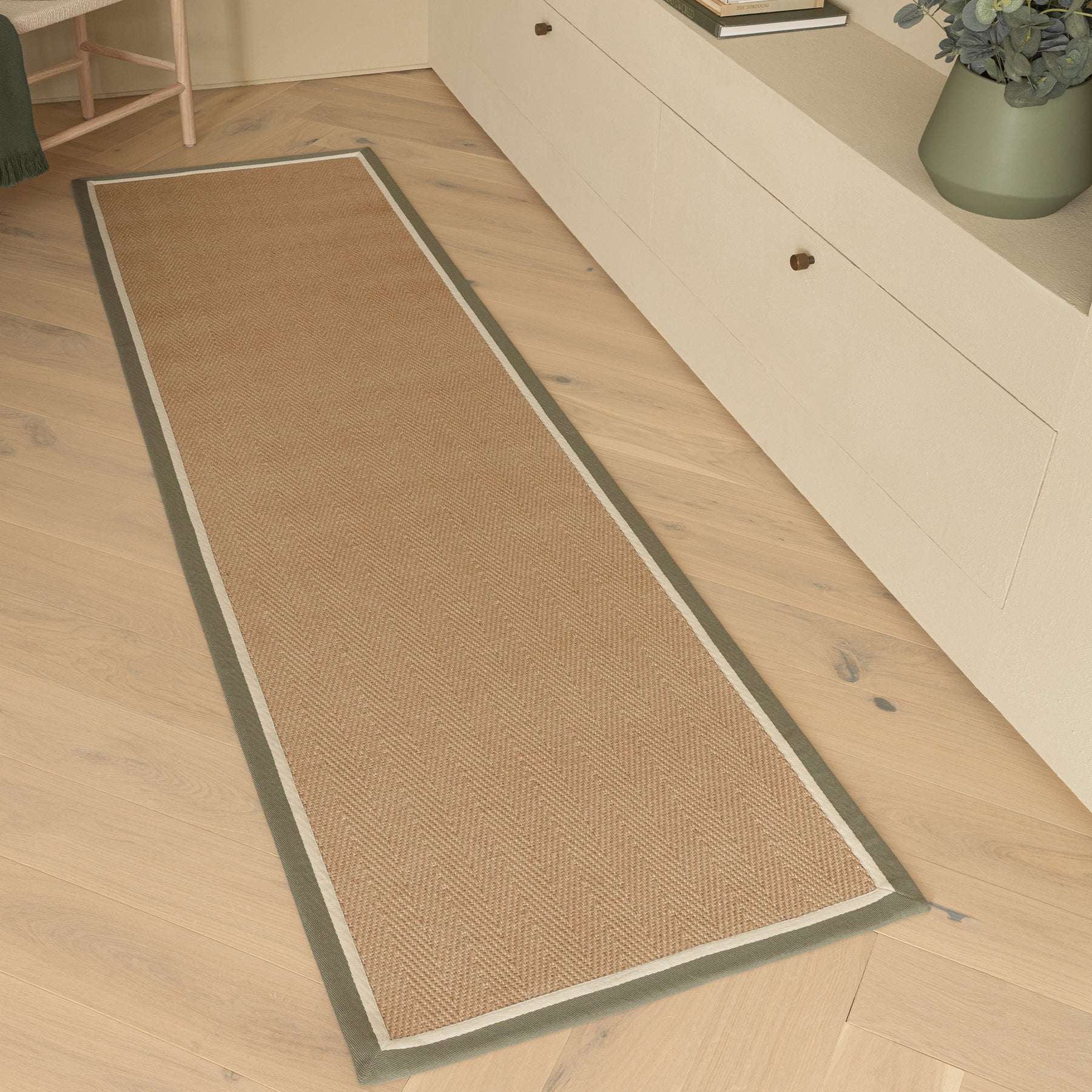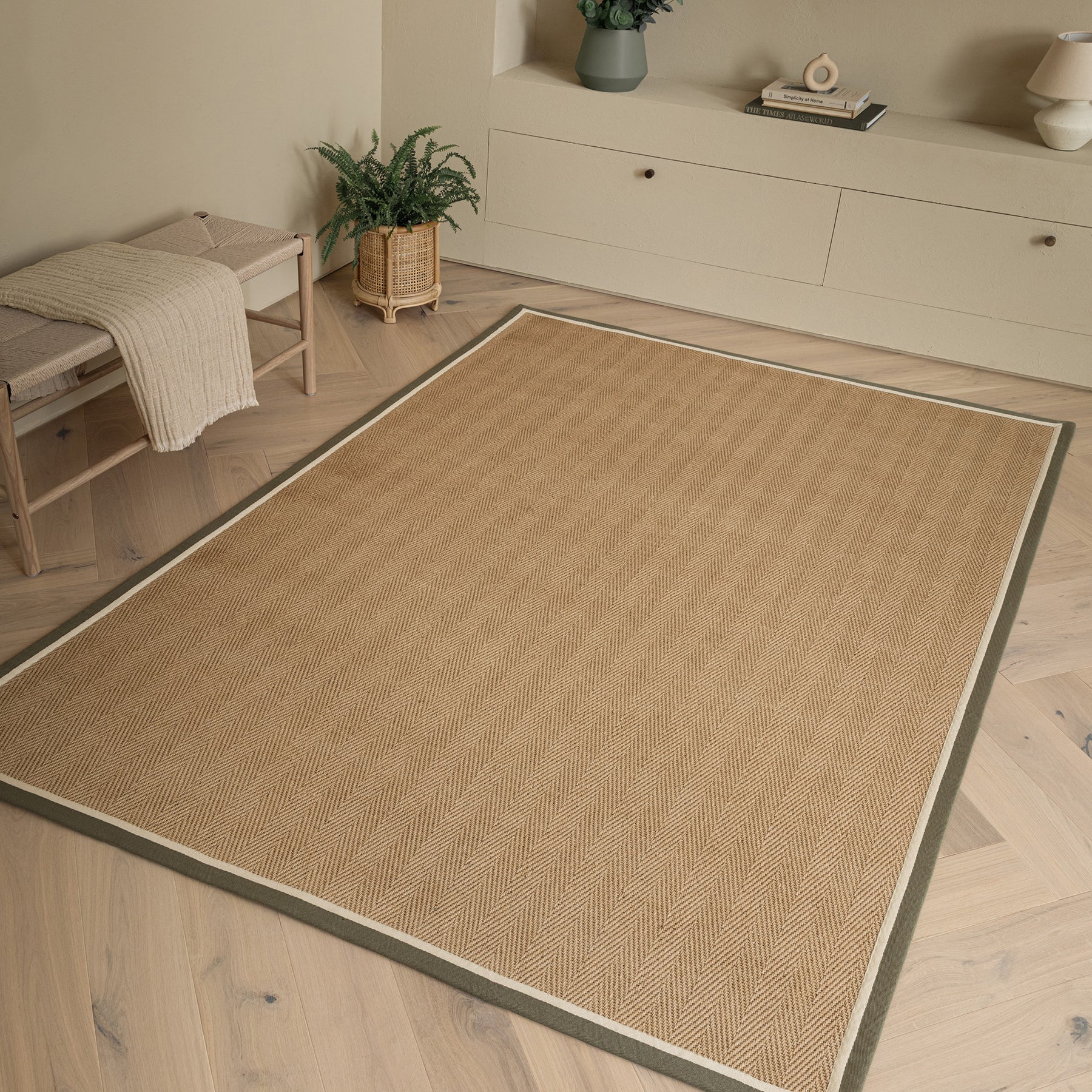A natural, grounding layer, this sustainable jute rug brings warmth and texture to a space. The subtle herringbone weave adds quiet detail, while the khaki border frames it with a clean, contemporary edge.