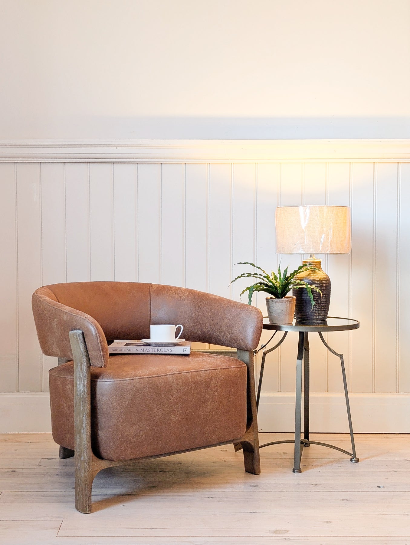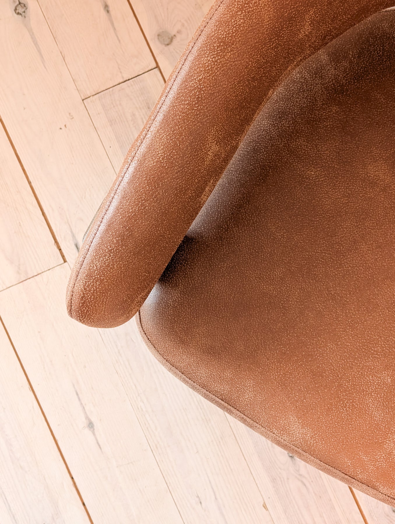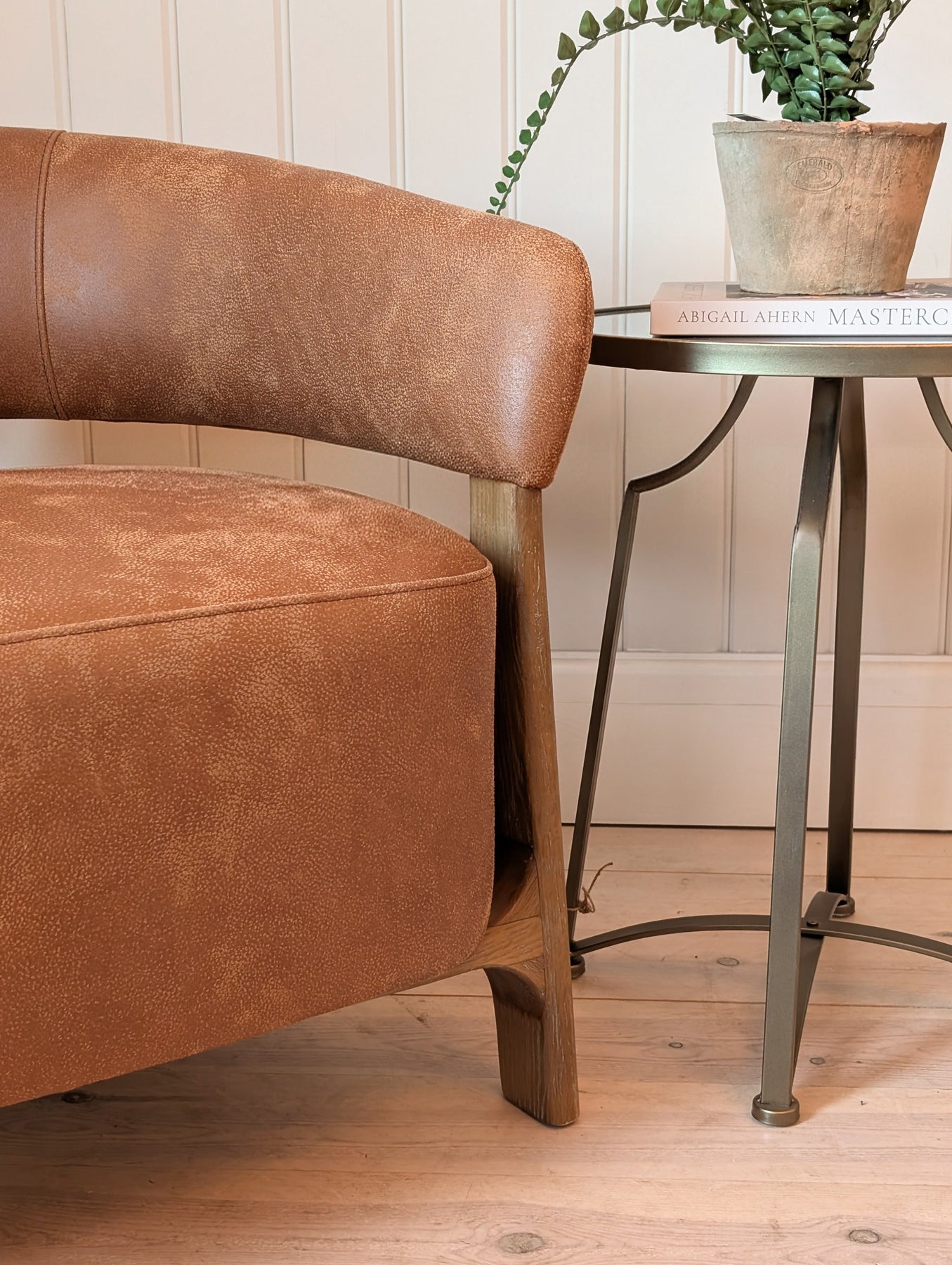 Upholstered in a rich tan leather, the finish adds warmth, depth and a natural character that only improves with time.