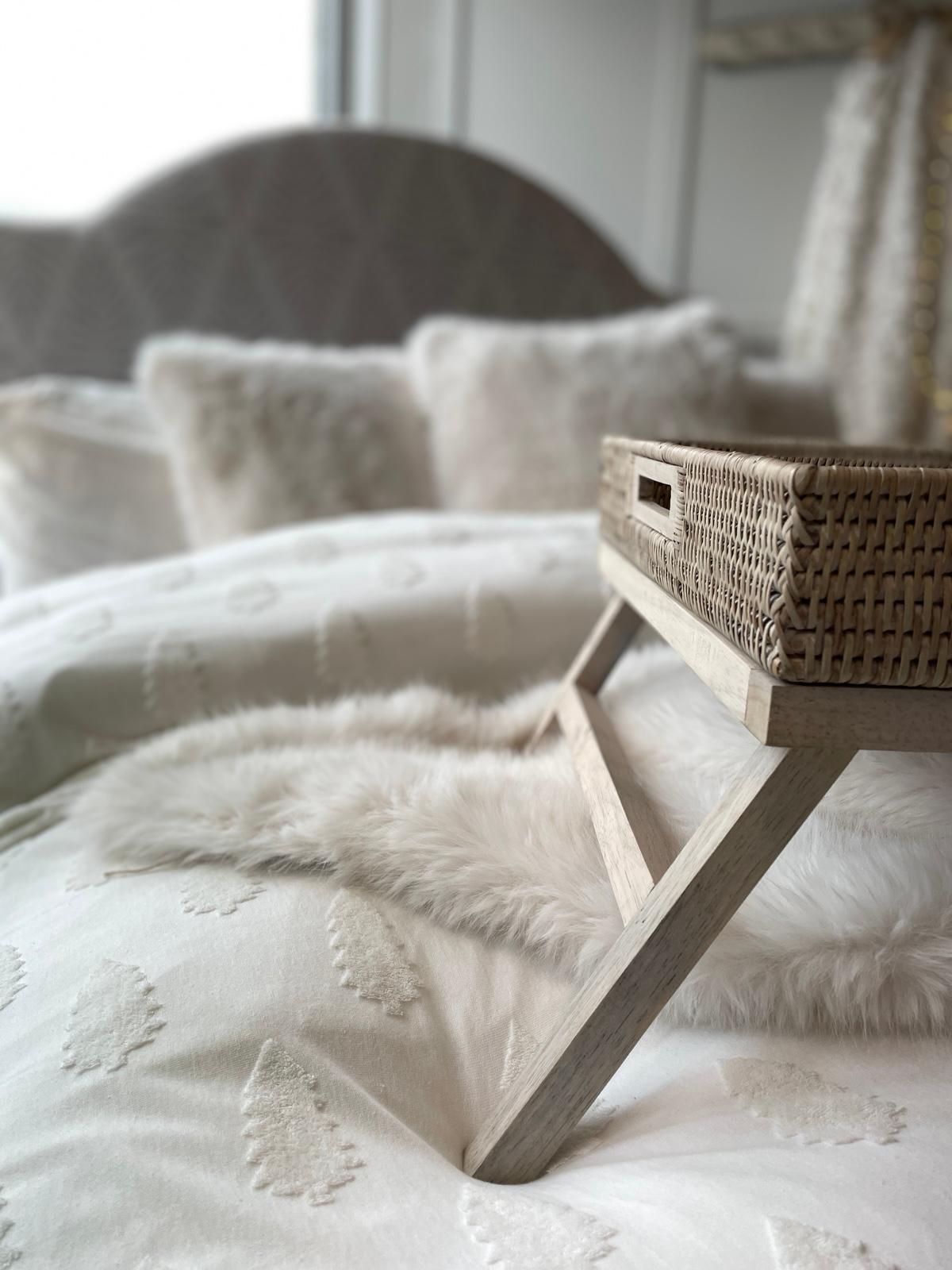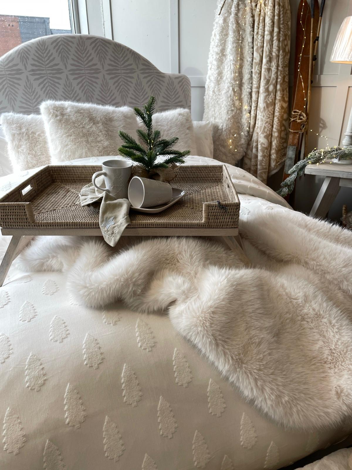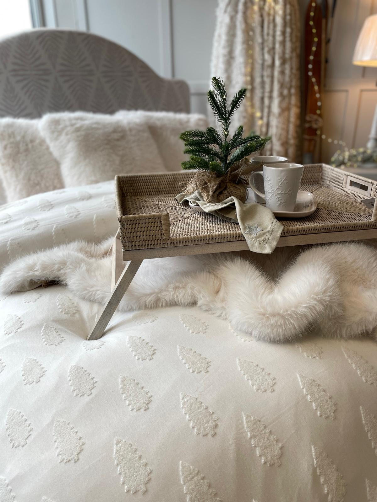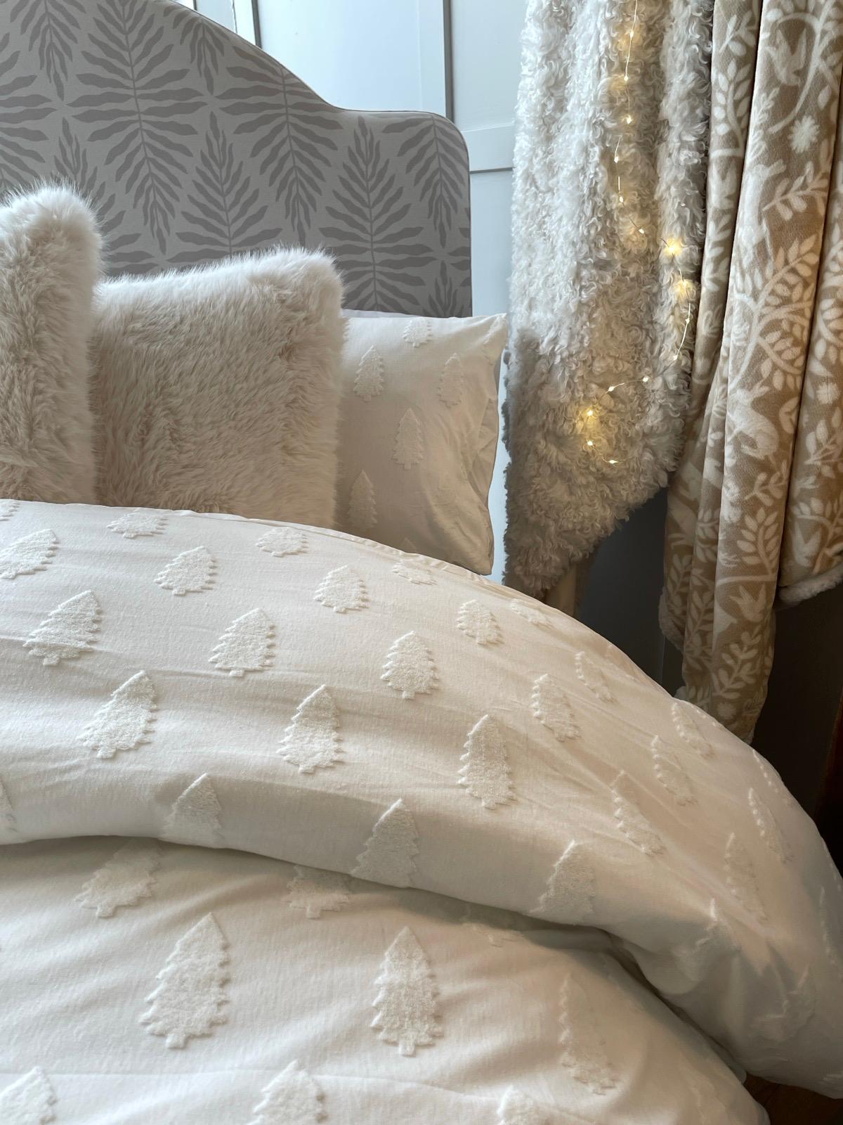 Crisp, cosy and quietly festive. This 100% cotton bedding set pairs a soft cotton jersey front with delicately embroidered trees and a smooth cotton reverse. In warm winter white and perfect for winter layering, it includes a duvet cover and two pillowcases for an effortlessly serene seasonal look.