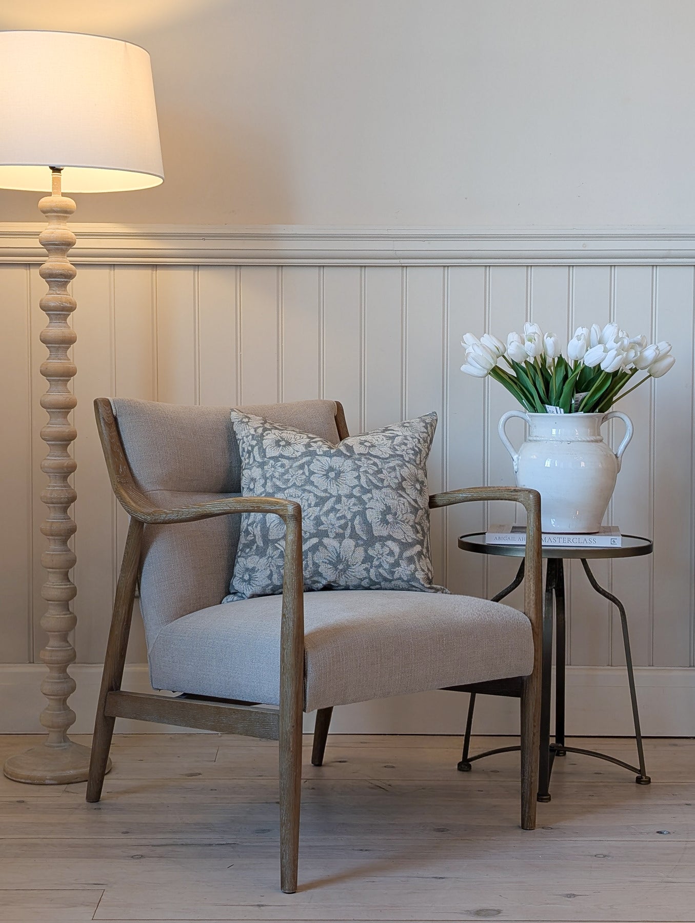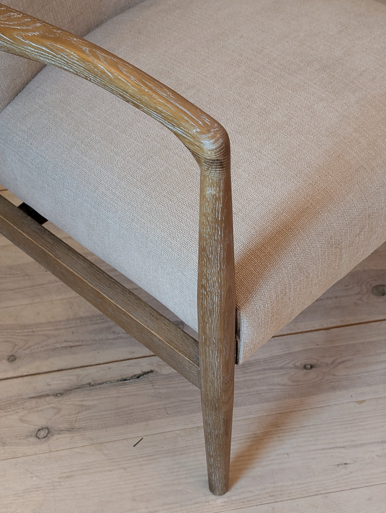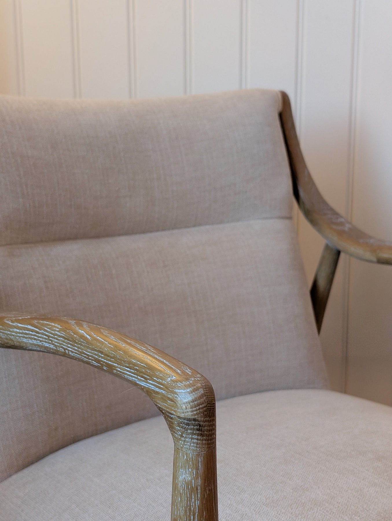 With its softly curved arms and relaxed proportions, this armchair is designed to bring effortless comfort to your home. The upholstered seat and gently sloping back create an inviting place to unwind, while the subtly weathered wooden frame adds warmth and character. Finished in a neutral fabric, it’s easy to style in any space.